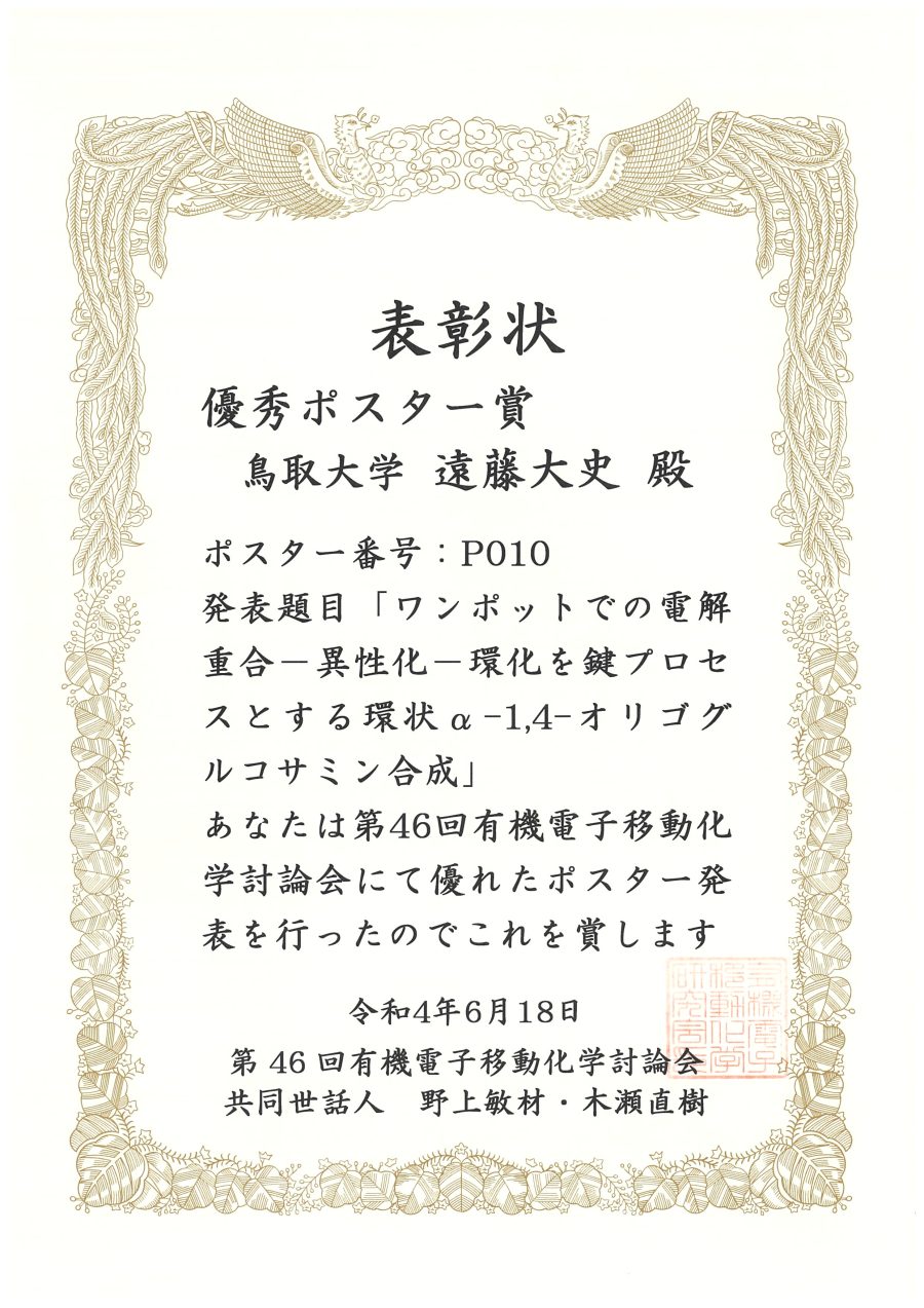 2022年6月17日-18日にオンラインで開催された第46回有機電子移動化学討論会において、ポスター発表の内容が高く評価され、野上 有機合成化学研究室の遠藤大史さん(M2)が下記の賞を受賞しました。