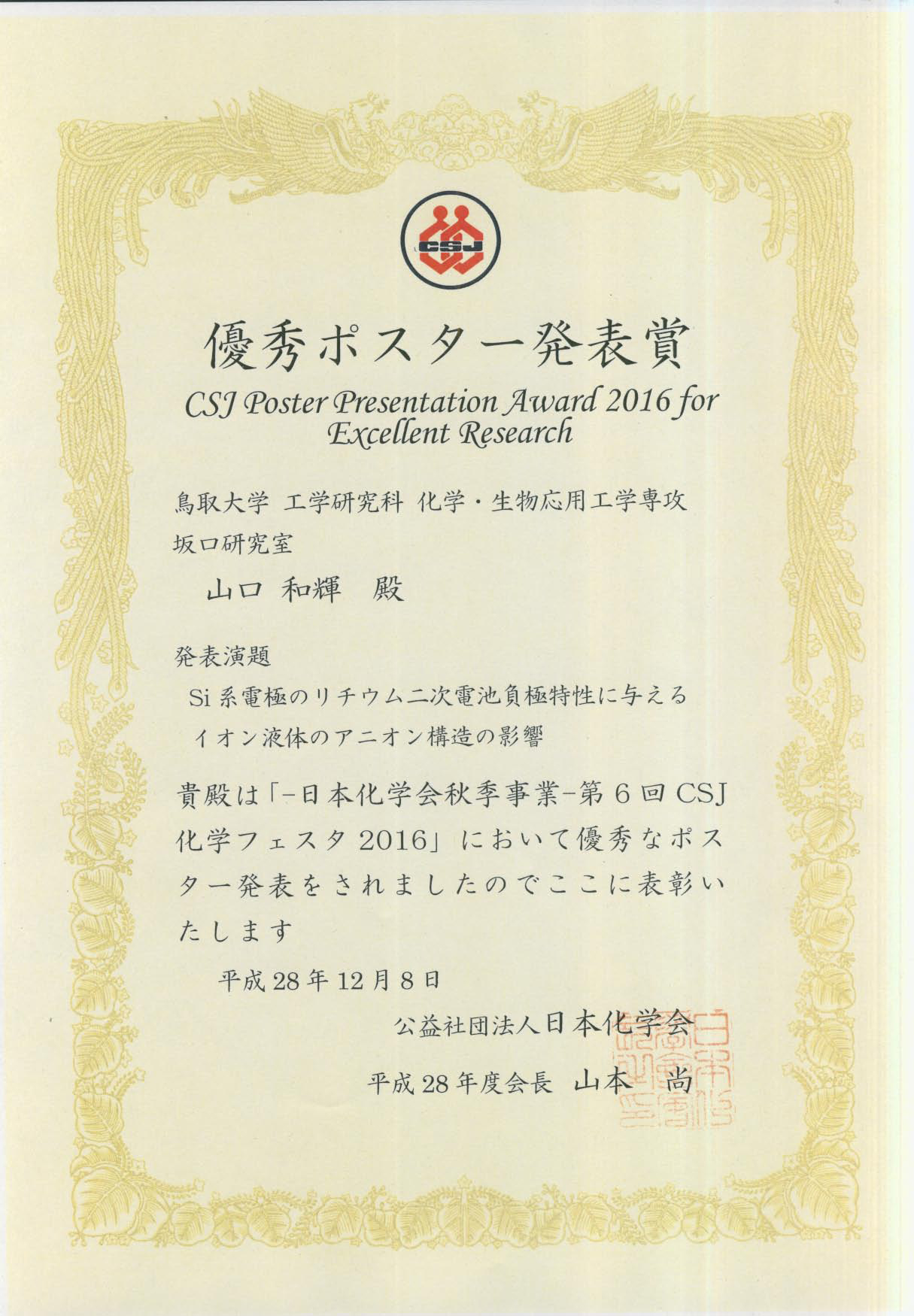 坂口研究室のD1院生の山口和輝君が行った、第6回CSJ化学フェスタ2016(11/14,タワーホール船堀)での ポスター発表が高く評価され、優秀ポスター発表賞(材料化学分野)を受賞しました。