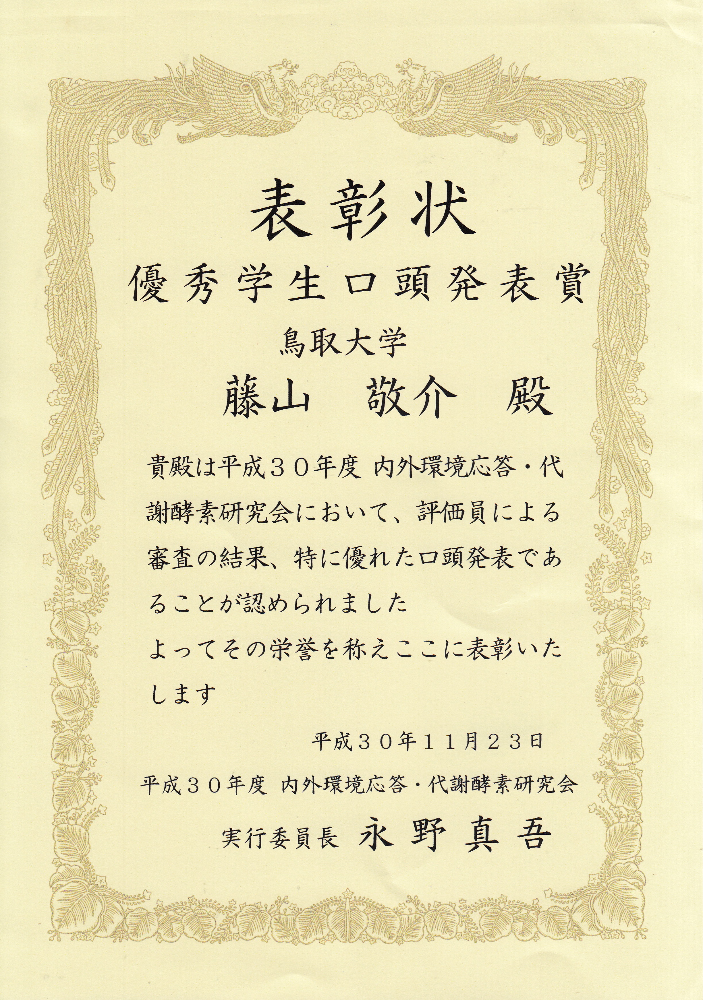 学生受賞(永野研究室):平成30年度内外環境応答・代謝酵素研究会 学生優秀口頭発表賞を受賞!