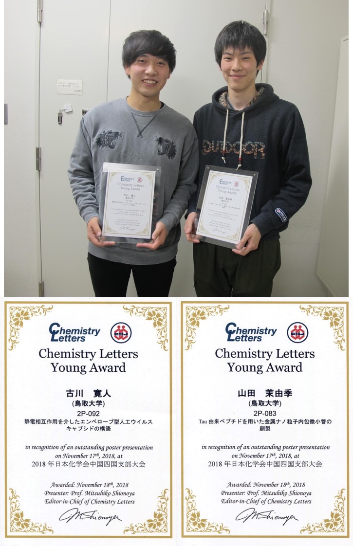 松浦研究室の学部4年生の古川寛人君と博士前期課程1年の山田茉由季君が、 2018年11月16-17日に開催された2018日本化学会中国四国支部大会(愛媛大学)での 発表内容が高く評価され、ポスター賞(Chemistry Letters Young Award)を受賞しました。 受賞題目は以下の通りです。 古川寛人君『静電相互作用を介したエンベロープ型人工ウイルスキャプシドの構築』 山田茉由季君『Tau由来ペプチドを用いた金属ナノ粒子内包微小管の創製』 副賞として、日本化学会の速報誌"Chemistry Letters"の1年間無料購読権も授与されました。