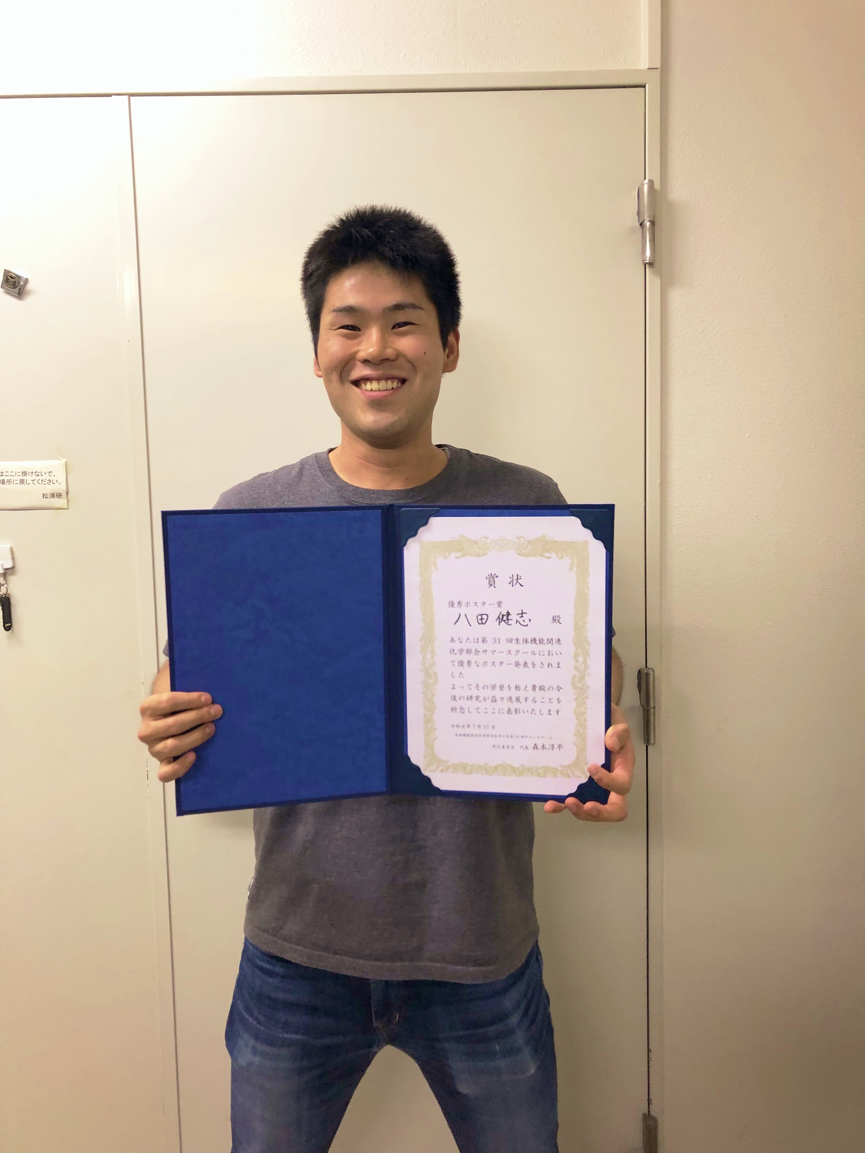 松浦研究室の博士前期課程1年の八田健志君が、2019年7月16-17日に開催された日本化学会生体機能関連化学若手の会サマースクール(八王子セミナーハウス)での発表内容が高く評価され、優秀ポスター賞を受賞しました。受賞題目は以下の通りです。